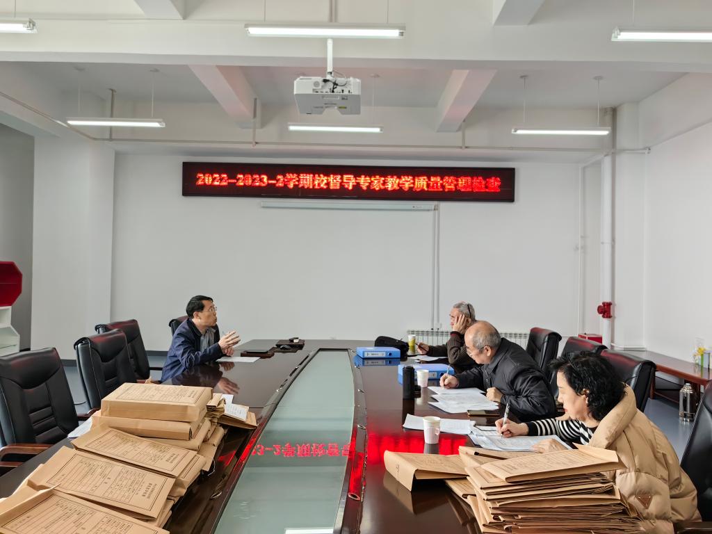 会议室,督导组认真查阅教学相关材料,随机查阅课程11门课程,抽取了33名学生的试卷,抽查了试题试卷归档情况。在督导过程中,赵俊利老师等对足球赛事直播